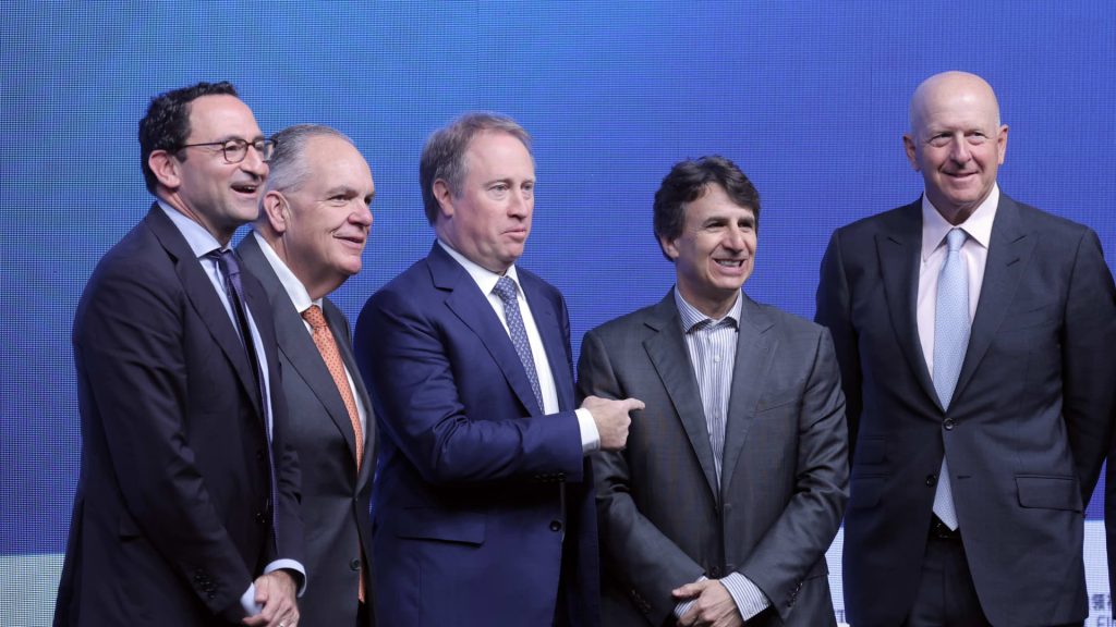 Jonathan Gray, président et chef de l’exploitation de Blackstone Inc., de gauche à droite, Ron O’Hanley, président-directeur général de State Street Corp., Ted Pick, président-directeur général de Morgan Stanley, Marc Rowan, président-directeur général d’Apollo Global Management LLC, et David Solomon, PDG de Goldman Sachs Group Inc., lors du Sommet mondial sur l’investissement des dirigeants financiers […]